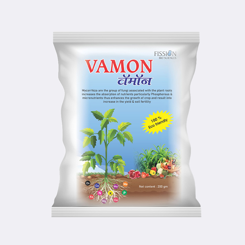VAMON contain Mycorrhiza are a group of beneficial fungi that form symbiotic associations with the roots of most plants. These fungi extend the root system through a network of hyphae, significantly increasing the plant's ability to absorb water and essential nutrients—particularly phosphorus—from the soil.